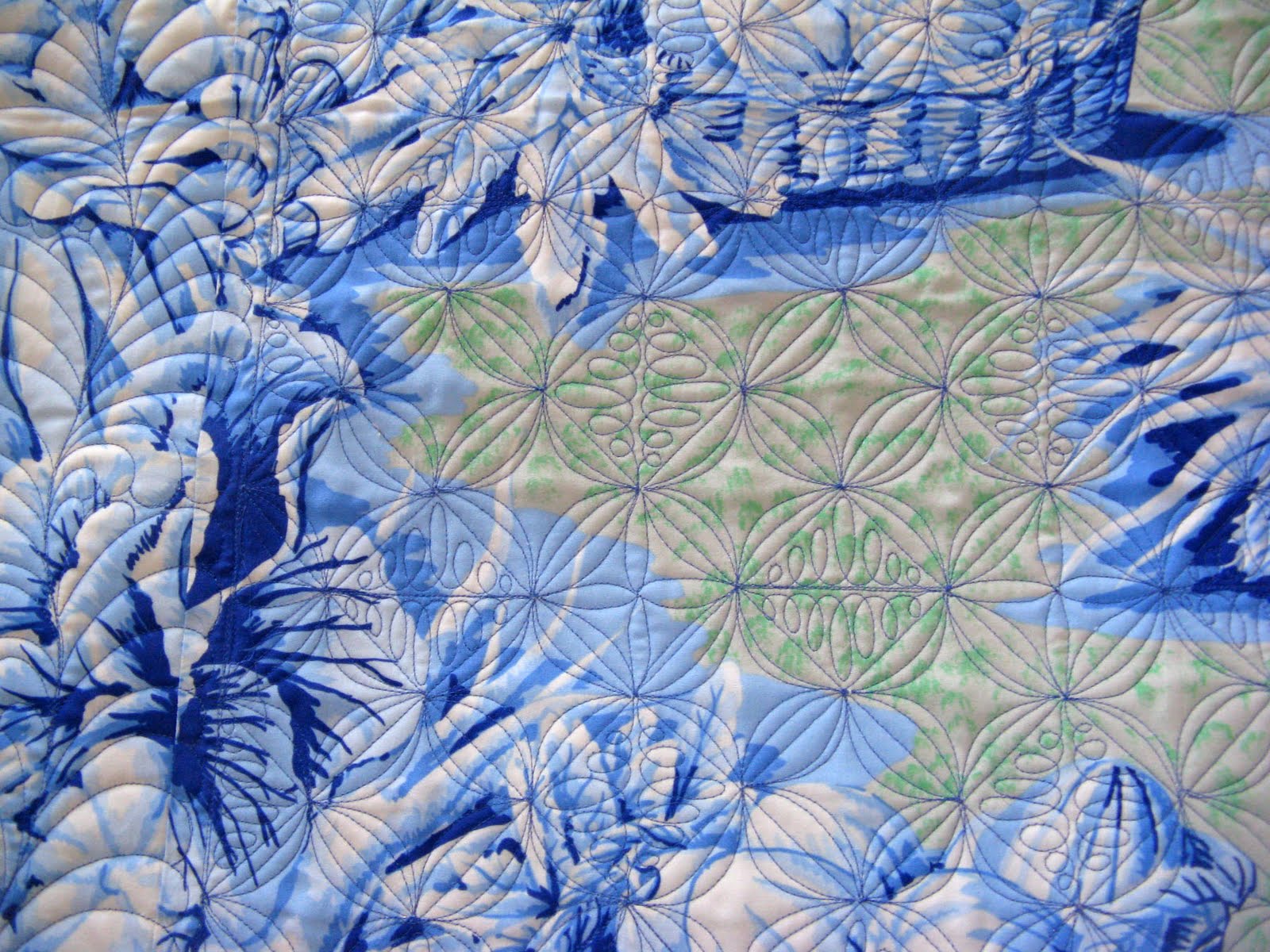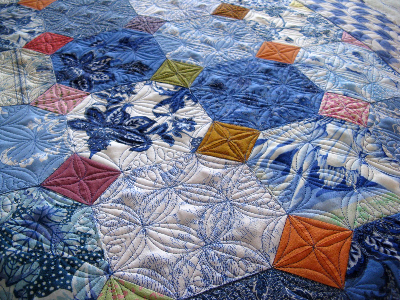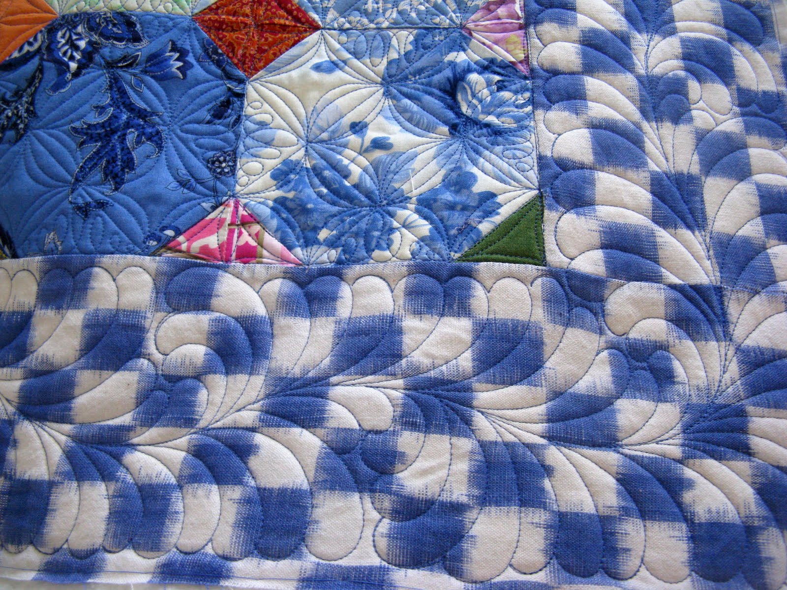 This is Beth's quilt. She is an excellent piecer - the quilt is totally straight - especially the triangles in the corners of the blocks - they matched up perfectly! It worked really well with the technical quilting I did in this quilt. A lot of ruler work, stitch in the ditch, and connecting lines. I thought this would go by super fast, but each row of squares (14) took me an hour and a half and that's without stopping (add in the interruptions - sore back and feet - and it took a while. I was able to connect all the straight lines and connecting lines without having to start and stop repeatedly. The more you quilt, the better you get at figuring which way to quilt so you don't have to start and stop over and over again. I love it - makes life easier.