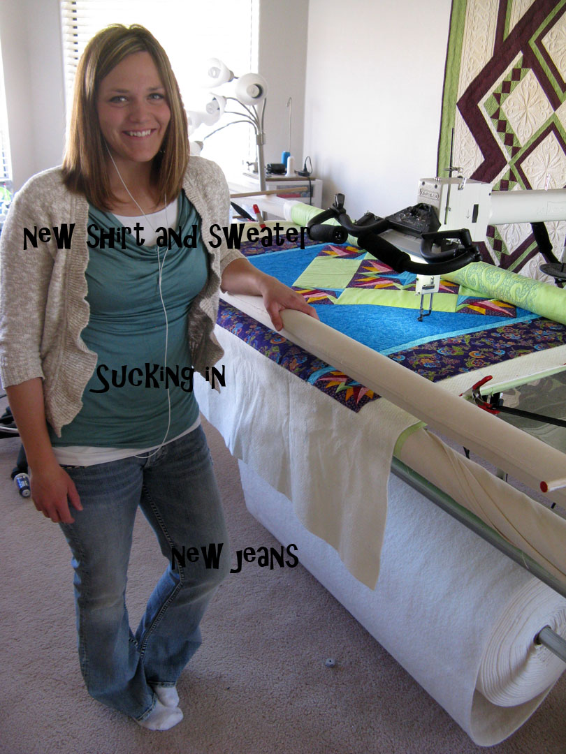 Okay - so confessions here - I quilt in my sweats - I have, now let me count.....................oh I think about 20 different sweat pants - Clint hates them, but I happen to love being comfortable - but mostly because my jeans at this point aren't comfortable. So, last night on a whim I decided to go and spend my spoils for some new clothes, and hopefully make myself a little more attractive to the guy working behind me. I went to Maurice's and the girl was awesome! I told her I knew nothing about clothes because I am a t-shirt and sweats kind of a girl and she threw several outfits together for me. This is one of them and I happen to like it - my jeans are comfortable - because they fit and the top with the sweater is nice. I felt so much better going out today! Anyway - long story short - Clint told me my shoes don't match - What? Are you the fashion guru? Don't you know I do this to please you - not me, because I would rather be quilting in my sweats.