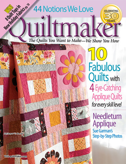 A lot of you don't know that my mom and I started out on our quilting adventure together. She loves to design, and she is wonderful at it. She makes beautiful quilts with her own designs that you just want to make. That is what I thought when she showed me her original "Flea Market Flowers" quilt. I have dibs on the original one... Anyway, I have been trying to get my mom to get out of her comfort zone of just showing a few friends and me her quilts, so she submitted this design to Quiltmaker and she was pleasantly surprised to have it accepted. She designed it, pieced it, quilted it and did a beautiful job. She was nervous though, and didn't hear back once it was sent off, the waiting game started and she started to worry that they didn't like the quilt. Well, I was at dinner one night and my mom called me and told me she was sent two copies of the magazine and HOLY COW - she was the cover!! I have never been more happy and so excited for my mom. She worked so hard on this quilt and what a reward to be the cover girl on her first magazine quilt submission.