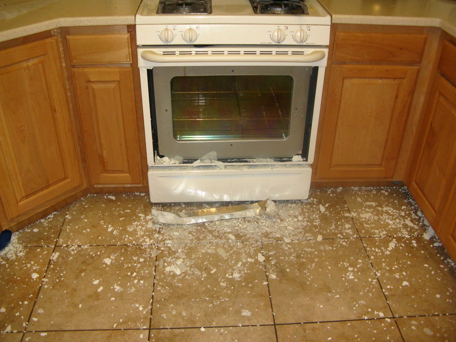 Apparently it does. Clint and I went on a date and when we got home, I waited in the kitchen for our babysitter to get her shoes from outside and then all of a sudden I heard a huge explosion. I looked straight ahead and saw that the oven glass pane had completely shattered. I was the only one in the room, but the babysitter and Clint both heard the noise. We were all dumbfounded. Seriously, I stood there in shock, like "what the heck just happened?"