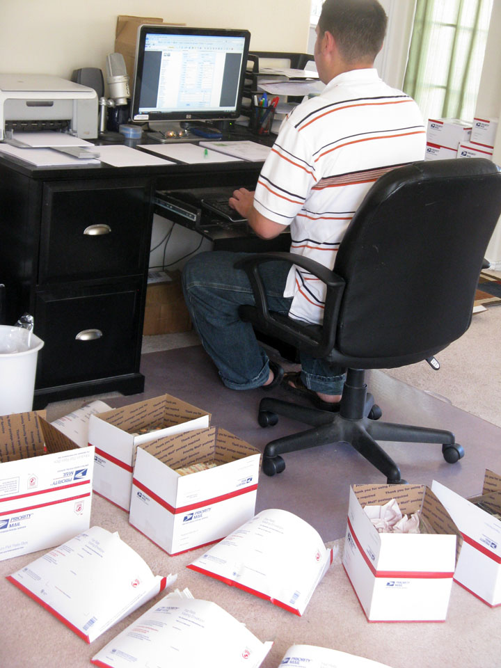 He packs the orders and puts them by the door - then he bags them up and the postman comes to our door and takes the packages from there.