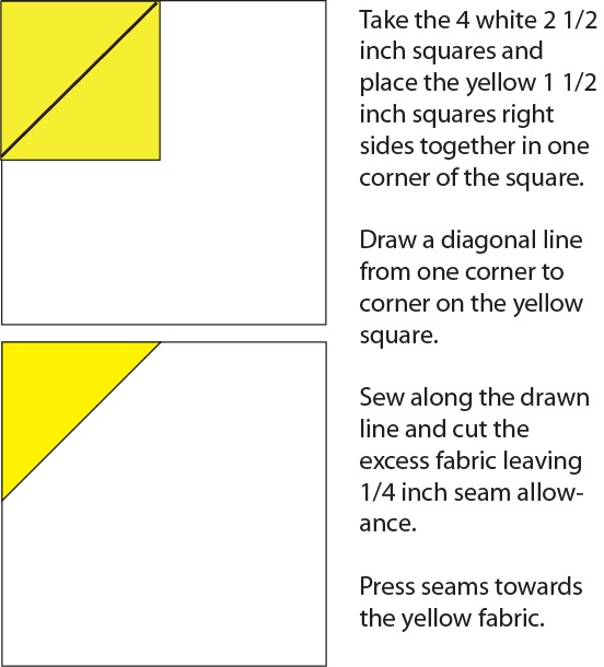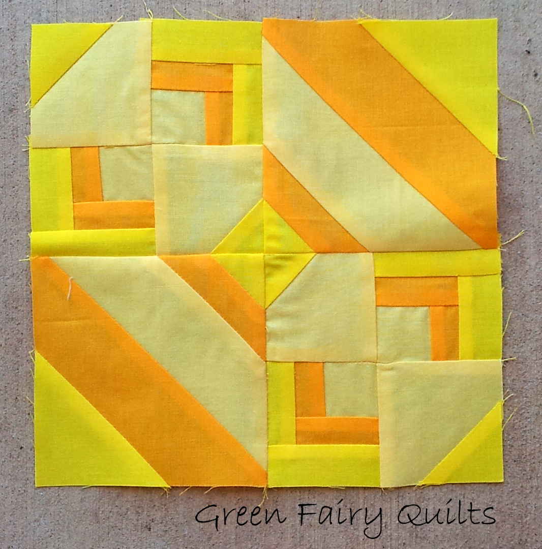 Here is my block in yellows, Kona solids are awesome to work with. Fun, fun! Since I still don't have my camera, and since all the pictures I took of the step-by-step instructions with the first block were on the memory card of my missing camera - I worked out the design in illustrator for you. So, here is my tutorial for the block starting with what you will need:
