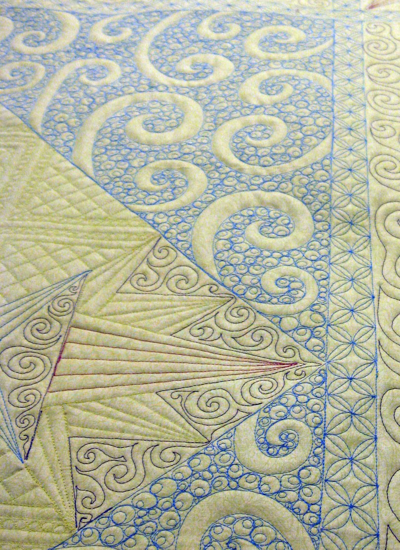 This coloring is much better and you can see the awesome effect of the quilting in the green - also time consuming, but worth it. I love it! I just marked the quilt with a disappearing purple marker and I used my 9 inch ruler to do the rest. It worked out so nicely because of how well Jen piece this quilt. It was very straight.