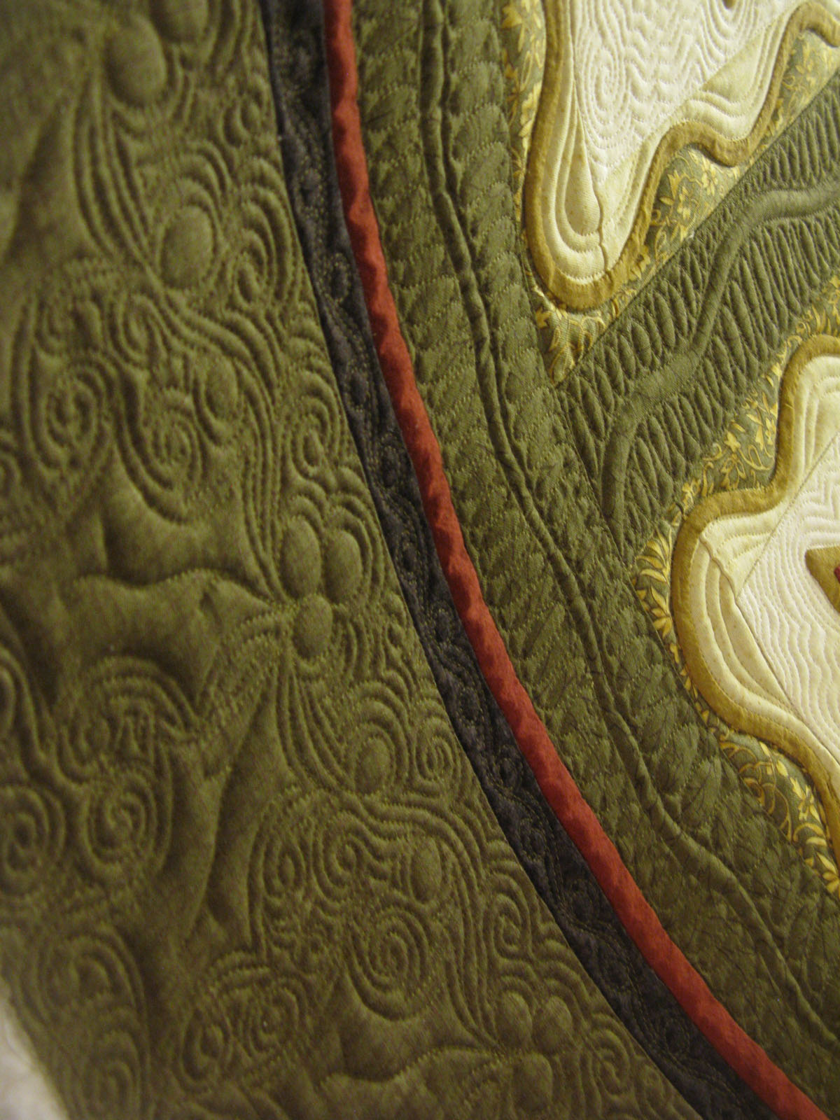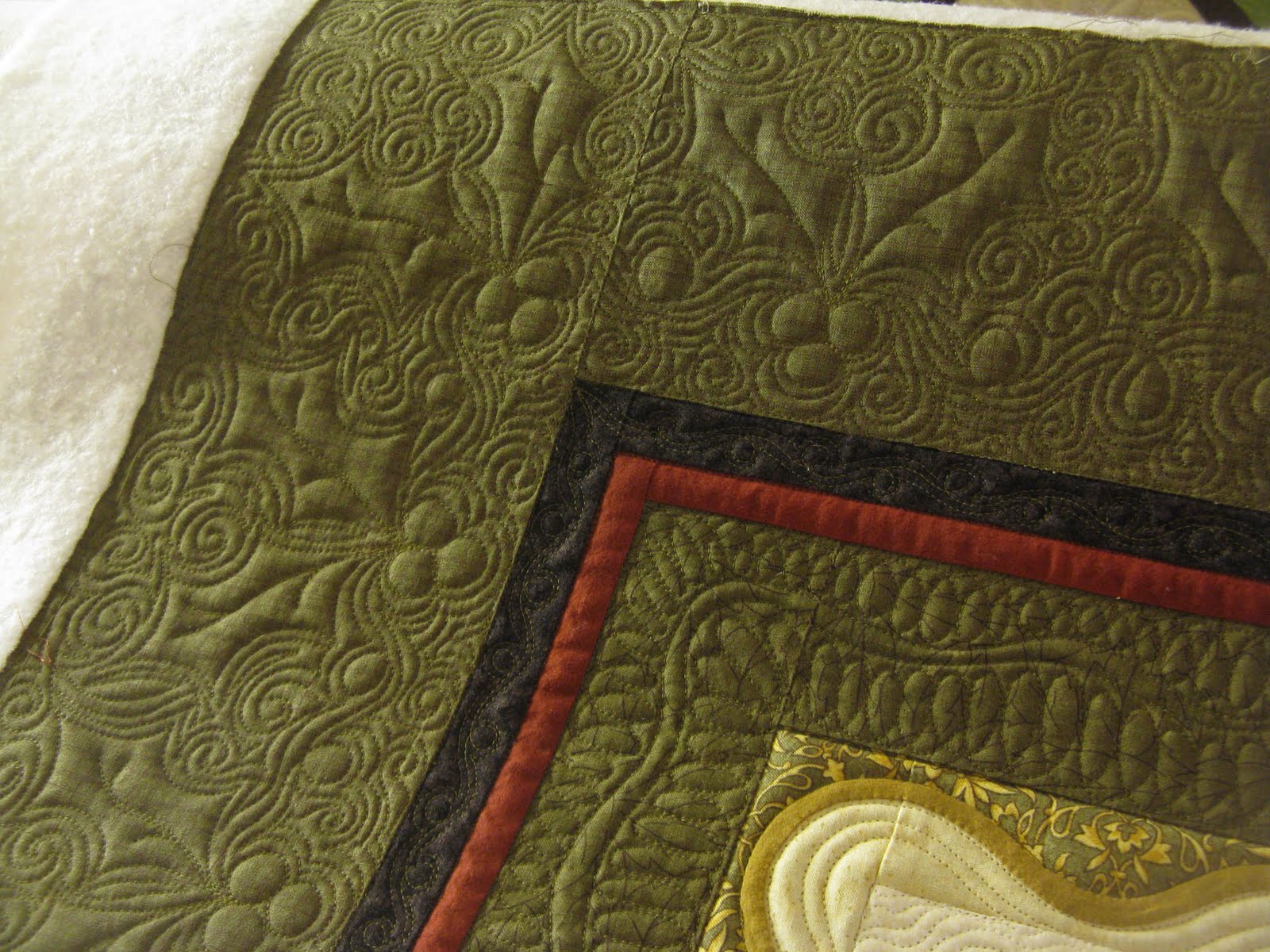 This is what I came up with for the holly and berry. I totally love it. This quilt is on the smaller size and just this border took me over 5 hours. I traced in the holly and berries individually connecting each one with a couple loops. Then I filled it in with swirls and echoing.