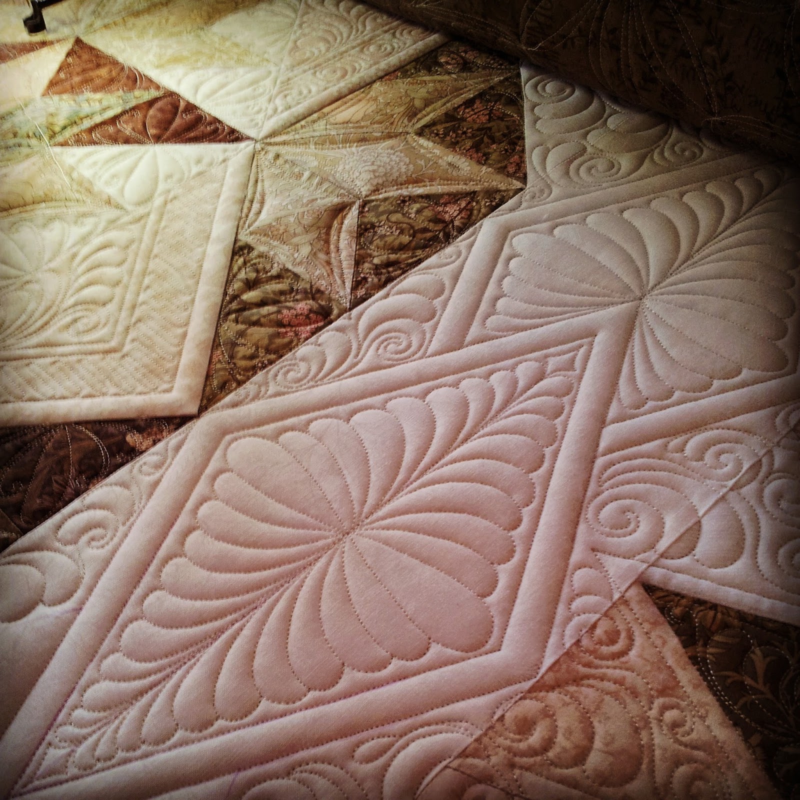I think it is working out nicely. My favorite parts are the free motion feathers in the triangles. The mirror image is just awesome! So fun to quilt.