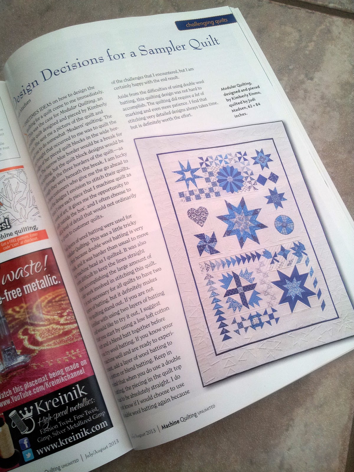 So, do you remember this quilt? I quilted this for Kimberly Einmo, the first of the year. It was such a fun quilt to quilt. I literally never got tired of the design, because every section of the quilt was different. Anyway, I took the time while I was quilting it to take a few pictures of my process. Then, I submitted my idea for a magazine article. Thankfully Kit liked my idea and my article was published in the Machine Quilting Unlimited July issue.