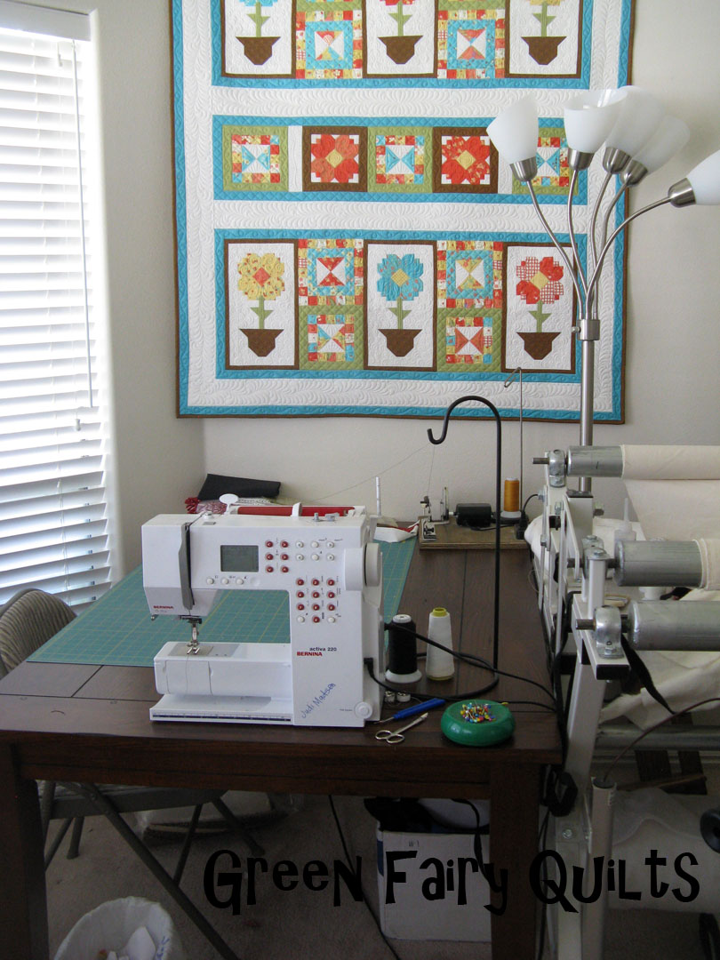 We moved my desk to the first bay window - the ironing board is in the middle and turned the right way, my sewing table is against the wall to the right and we moved the quilting machine into Clint's part of the office about 2 feet. That gives me room to sit at my sewing machine and to the side of the table.