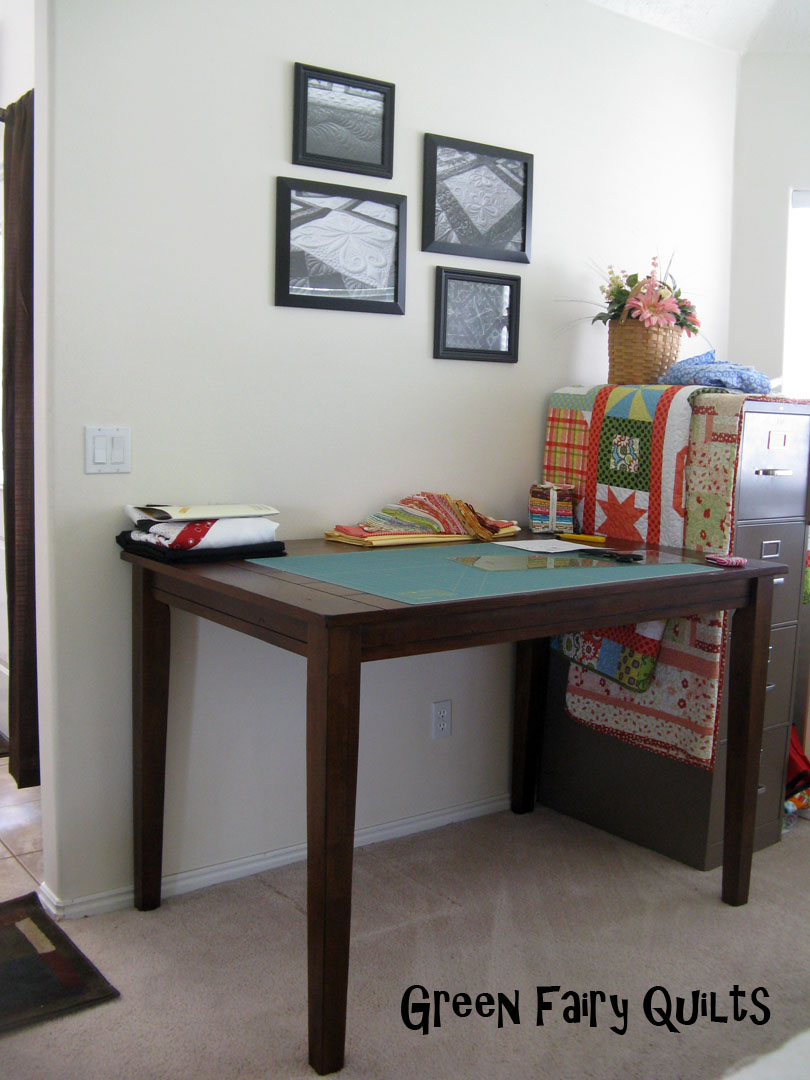 I have been wanting to fit a cutting table in here, but I haven't really thought about how to make it fit. As Clint and I were talking the other night about ways to make this work better we came up with an ingenious plan - I so wish we would have done this months ago. It's much more organized and it utilizes the space much better.