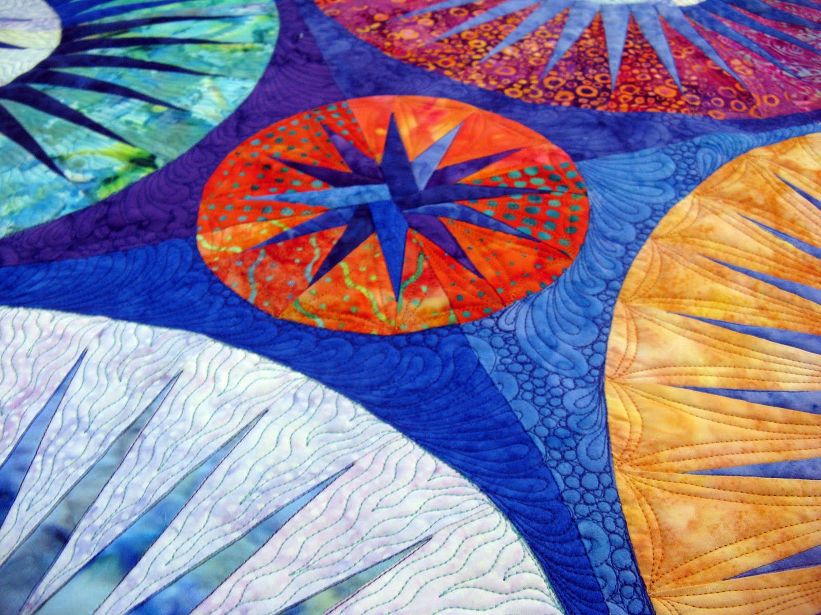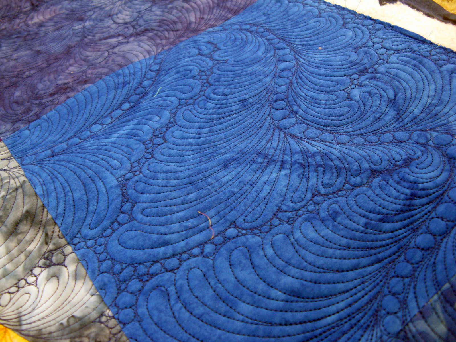 I did freehand feathers with circles in the center of the feathers for the background of the quilt. I then filled in the space with pebbling.